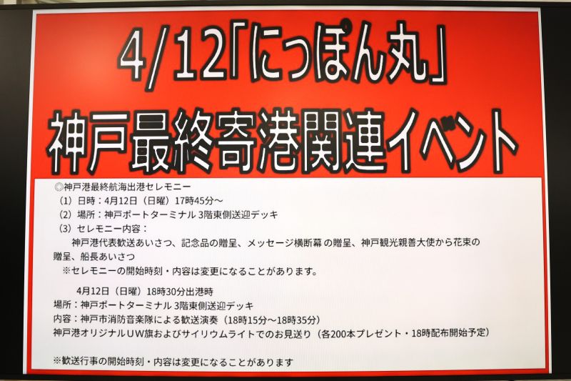 1990年9月に就航した3代目のにっぽん丸は三菱重工業神戸造船所で建造されました。神戸で進水し35年の長きにわたって度々ふるさと神戸を訪れ多くの市民に親しまれてきた客船です。ファンも多いにっぽん丸に感謝の意を伝えようと神戸最終寄港関連イベントが行われました