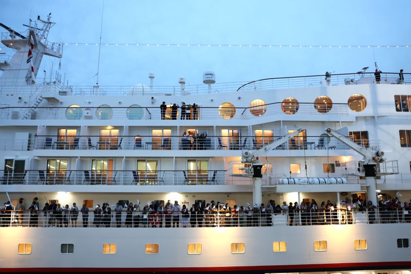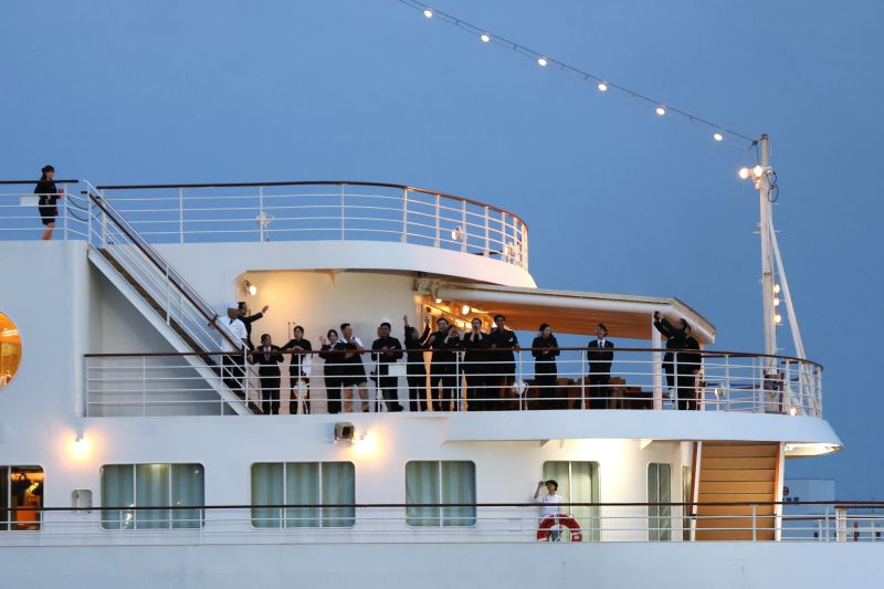 乗客やクルーの人たちが船上から「ありがとう」や「行ってきます」の声が発せられていました