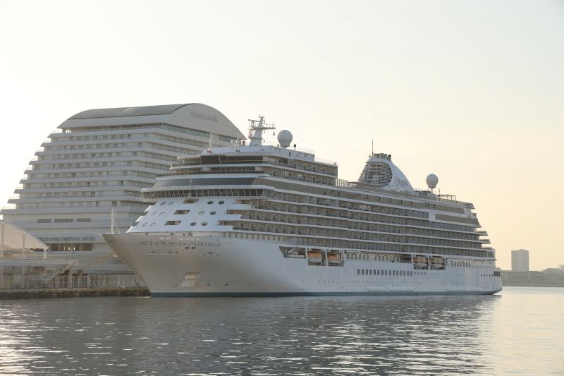朝陽を浴びる「セブンシーズエクスプローラー(総トン数55,254㌧)」