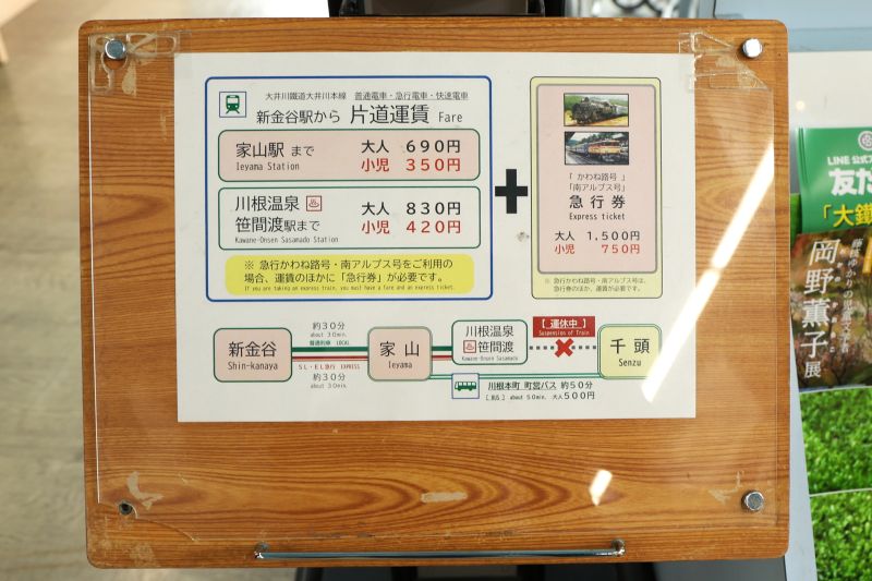 乗車料金は運賃に急行券代をプラス。なお2022年9月に発生した台風15号被害のため川根温泉笹間渡駅と千頭駅間は現在も運休区間になっています。そのため井川線を利用する場合は家山駅で降りて川根本町町営バスに乗り換える必要があります