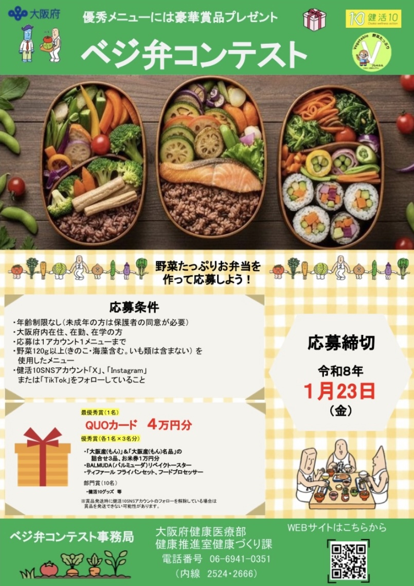 大阪府では「V.O.S」の普及をさらに進めるために「野菜たっぷりお弁当」、通称「ベジ弁」をテーマにした「ベジ便コンテスト」を開催します。