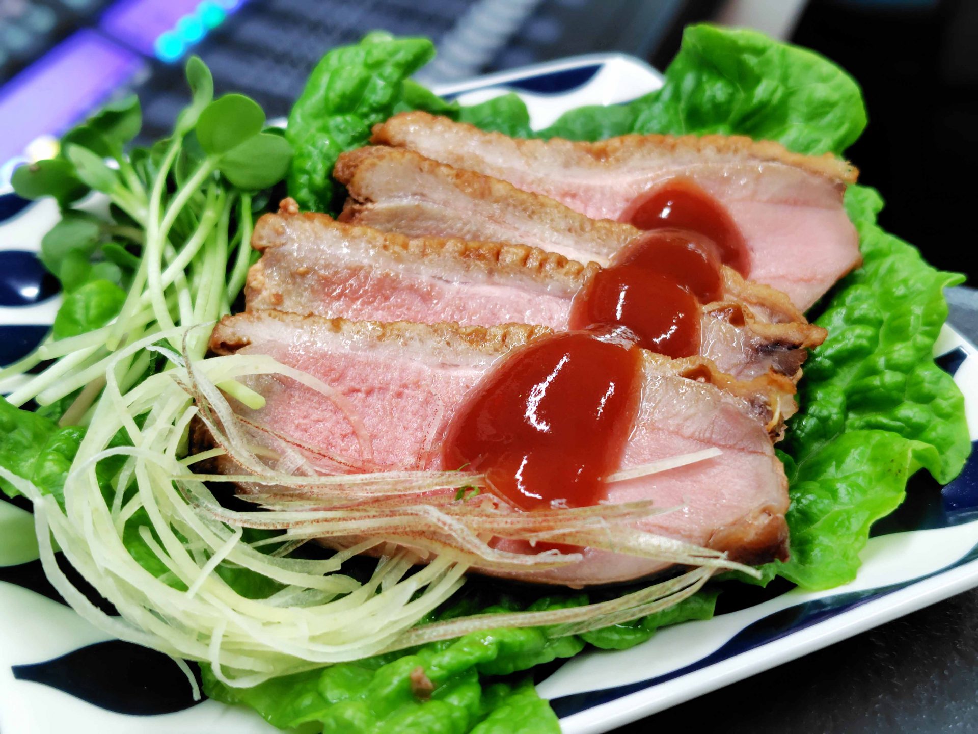 ③ミョウガ、しょうが、白ネギは千切りにして、鴨ロースは冷めたら切り出しに片栗粉でとろみをつける。サンチュ・カイワレ大根・大葉と先ほどのミョウガ・しょうが・白ネギを使って盛り付け上からロース煮のタレをかけて完成。