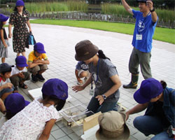 NPO法人こども環境活動支援協会のお兄さん、お姉さんが、捕まえた生きものの名前を教えてくれました。 |