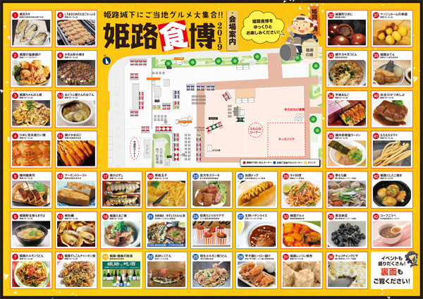 姫路のグルメはもちろん、高砂のにくてん、相生のホルモン焼きといった兵庫県各地のグルメを楽しむことができる。そのほかにも、メニューは盛りだくさん。姫路名物の立食いそば「えきそば」をはじめ、生姜醤油で食べる「姫路おでん」、姫路レンコンしゅうまい、ひめじ官兵衛(かんべえ)のたい焼き、播州赤穂塩ラーメン、「生野ハヤシライス」、志方牛ステーキなどのご当地グルメが楽しめる。さらに、ゴハンだけじゃない、お酒も、このイベントの醍醐味の1つ。神崎酒造、名城酒造、壺阪酒造、ヤヱガキ酒造、本田商店、田中酒造場、灘菊酒造といった姫路の7つの酒蔵が集まり、姫路地元の蔵元による地酒コーナーも用意されている。