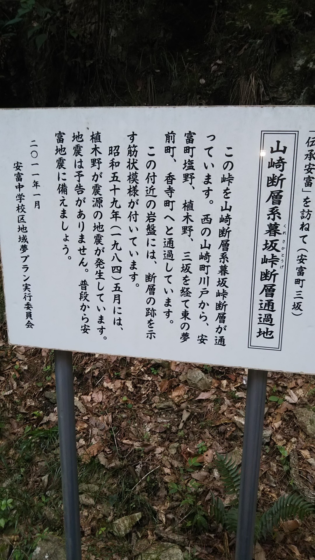 その露頭の1つ、三坂峠では地震で岩盤がずれるときに断層面にできる「条線」を観察。また、かつて繰り返された地震で2億5千万年前の硬い岩石が砕かれて粘土のようになった安富断層へ。