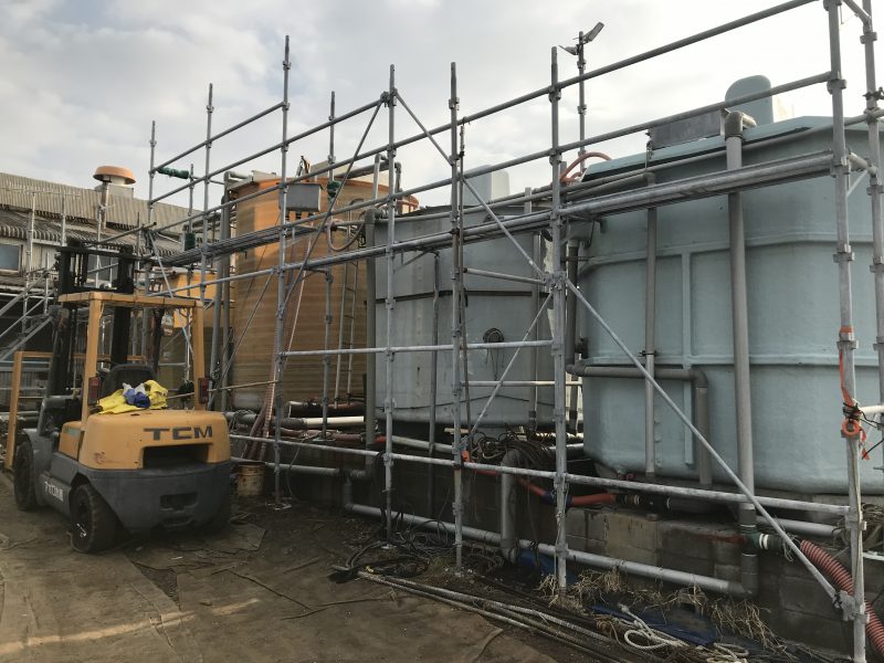 見学は貯蔵タンクからスタート。寿司のり15万枚分が入るという大きなタンクに、児童たちからは驚きの声があがる。地上から3メートルはある足場に上がらなければ、中を見ることはできない。おそるおそる階段を昇る児童たち。怖がりながらも、未知のものへの興味を感じる楽しそうな声が聞こえた。獲れたばかりのノリはこのタンクに溜められ、海水で洗う作業も同時に行われるそうだ。