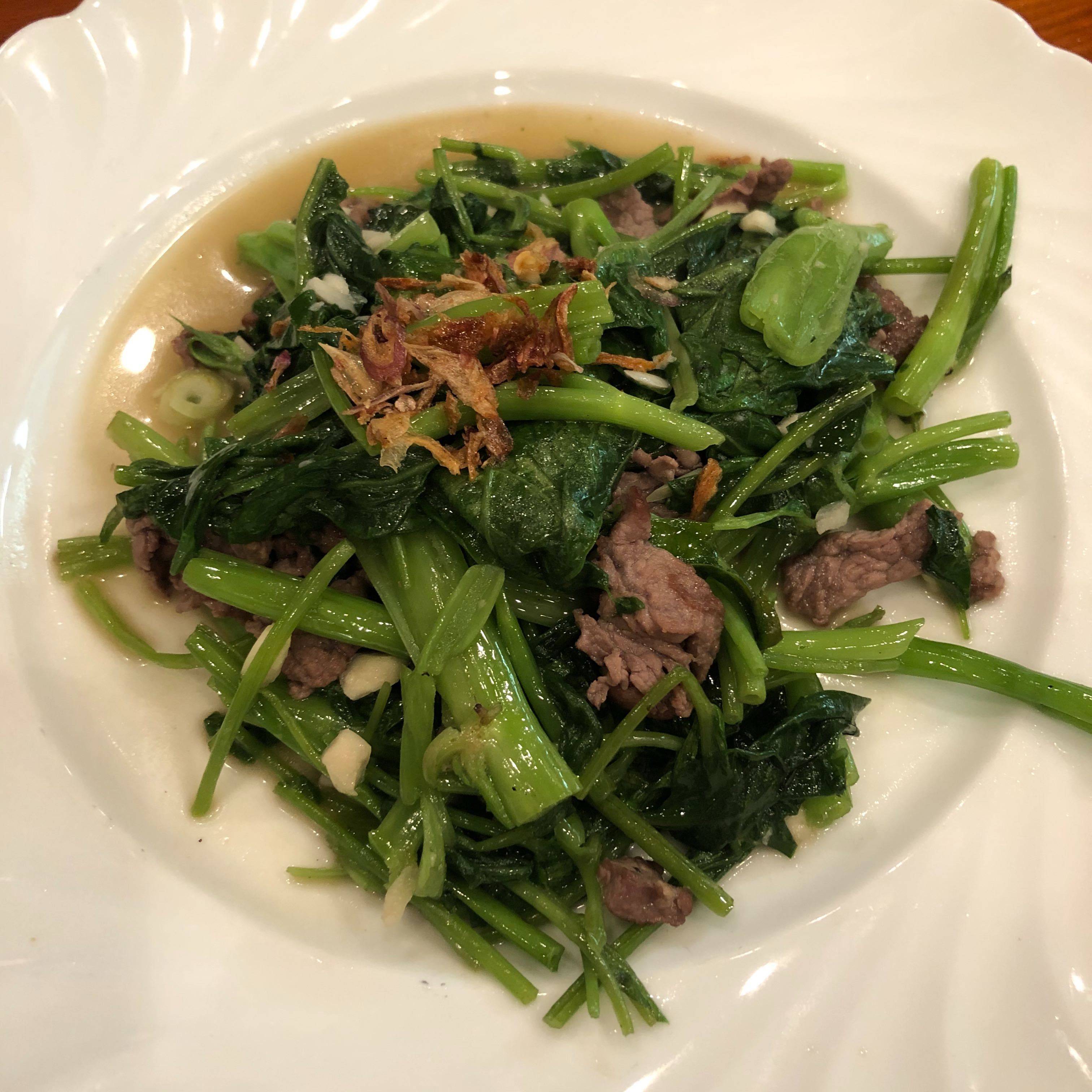 入店したのは午後9時半ごろ、長テーブルとカウンターだけの店内は大盛況で、まるで現地にいるような感覚になる。お店の中をシェフやホールスタッフがうろうろ。少しでも注文に迷うそぶりを見せると、「これ、美味しいよ!」「これ、ベトナムでも有名!」とアドバイスをくれる。メニュー表に『☆』がついているほど、特におすすめだという。今回は、『牛肉と空心菜炒め(800円)』と、『海老炒めメコン川風(880円)』を注文。野菜がたっぷりでボリューム満点、2皿でお腹は一杯に。