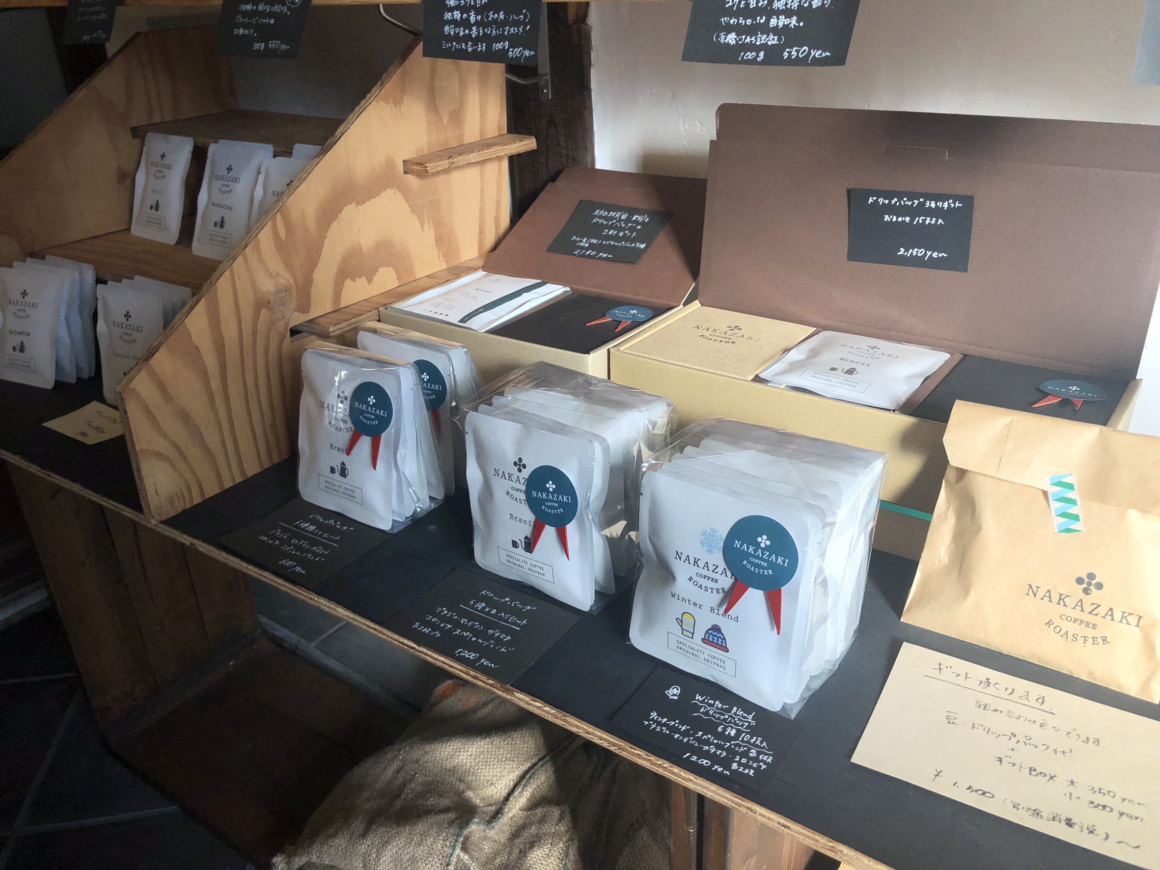 「NAKAZAKI COFFEE ROASTER」は2017年4月にオープン。長らくカフェや飲食店にコーヒー豆を卸していたが、「小売りもしてほしい」という多くの声を受けて一般客にも販売を始めた。もうすぐ築100年を迎えるという中崎さんの実家をリノベーションした温かみのある店内では、コーヒー豆(挽きも可)やドリップバッグ(マグカップ一杯分をドリップできる)などだけを買うことができ、飲み物の販売は行っていない。取材中も顔見知りの客が次々と来店した。