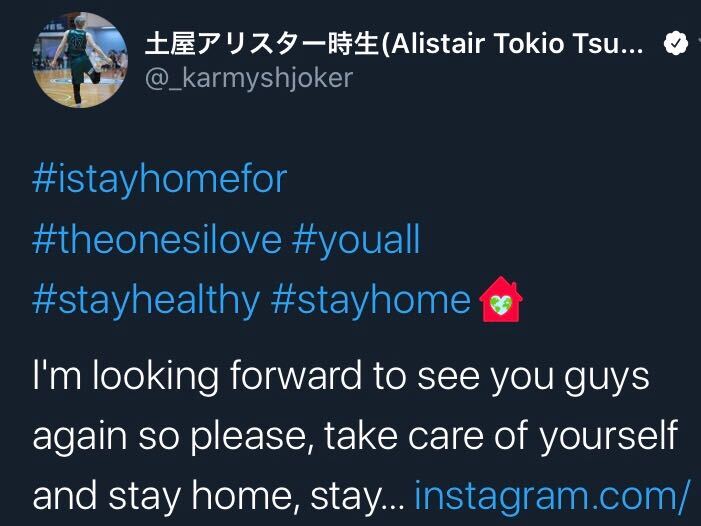 そうした状況の中、選手らはツイッターで「#IStayHomeFor(“大切ななにか”のために家にいよう)」などのハッシュタグをつけて積極的に投稿。ファンらに不要不急の外出の自粛などを呼び掛けている。地元・西宮市出身の土屋アリスター時生選手(24)は「またお会いできるのを楽しみにしています。お大事に、どうか家にいてください」と英語で世界中のファンに向け発信した。