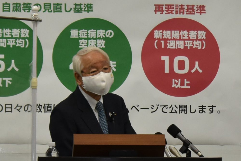 県は独自の基準として、(1)新規の陽性者数が5人以下(2)重症病床(71床)の空床数が40床以上の両方を7日間達成すれば現状の休業要請を見直すとしており、14日に達成した。