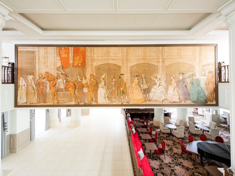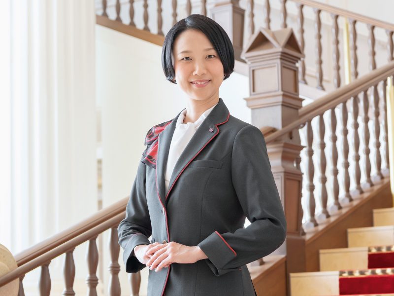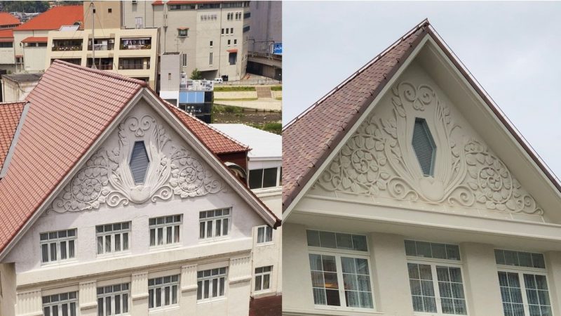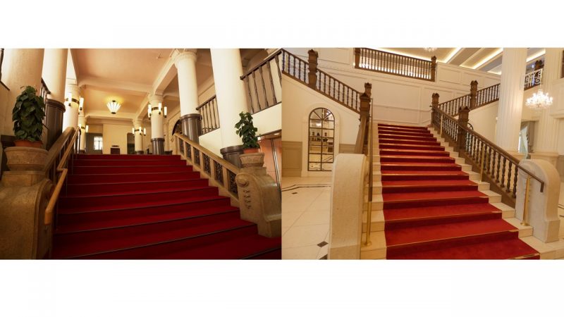 移転してもどこか懐かしく、格調高いクラシカルな建築デザインはそのまま。淡いピンクの切妻屋根はもちろん、植物をモチーフとしたレリーフの外装は以前と同様だ。回廊にあった特徴ある大きな半円アーチの窓は新しいホテルの1階に再現されているほか、本館階段にあった石造りの手すりの一部が新ホテルの1階階段に生かされている。「宝塚ホテル」の歴史と思い出を残し、継承するようなつくりになっている。