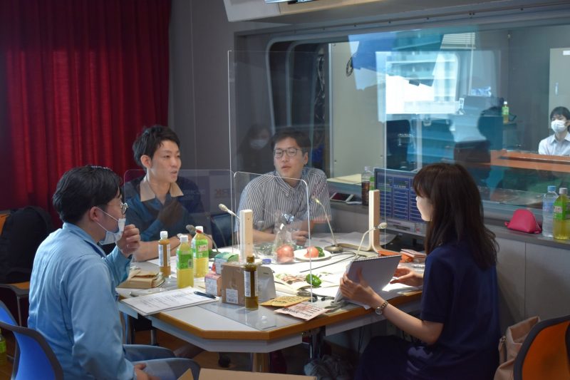 最初のテーマ「What is JA?」。JAとは営農事業、農家の資産管理事業、保険の生活文化事業など、農家を営む人々の仕事だけではなく生活も支える仕事だと説明する中鶴さん。現在は三田市の直売所でイベントの企画や、加工品の開発にも携わっており、スタジオにもお米やドレッシング、野菜などのお土産を持参してくれた。