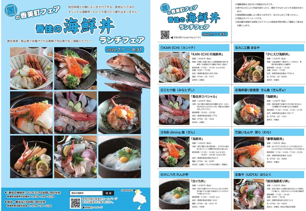 地元料理人が腕によりをかけて作るオリジナル海鮮丼を堪能! 香住漁港、柴山港では、シロイカ・アゴ(トビウオ)・ガシラ・アジなどが旬を迎えている。これらの魚を炙りにしたり、特性の出汁醤油で味わったり、おいしさを最大限に引き出した産地ならではの海鮮丼に舌鼓。香美町内8か所の食事処で8月31日まで開催。