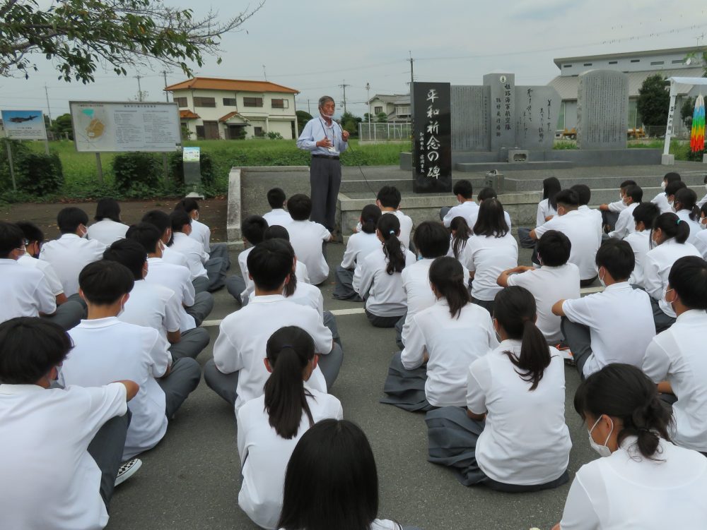 最後に滑走路跡わきに立つ平和祈念の碑前で平和集会を開き、学年代表が「人間の命を同じ人間が奪う戦争は起こしてはならない。私たちは言葉で解決する世界を創りたい。戦争についての学びを語り継いでいく」と誓いの言葉を述べた。