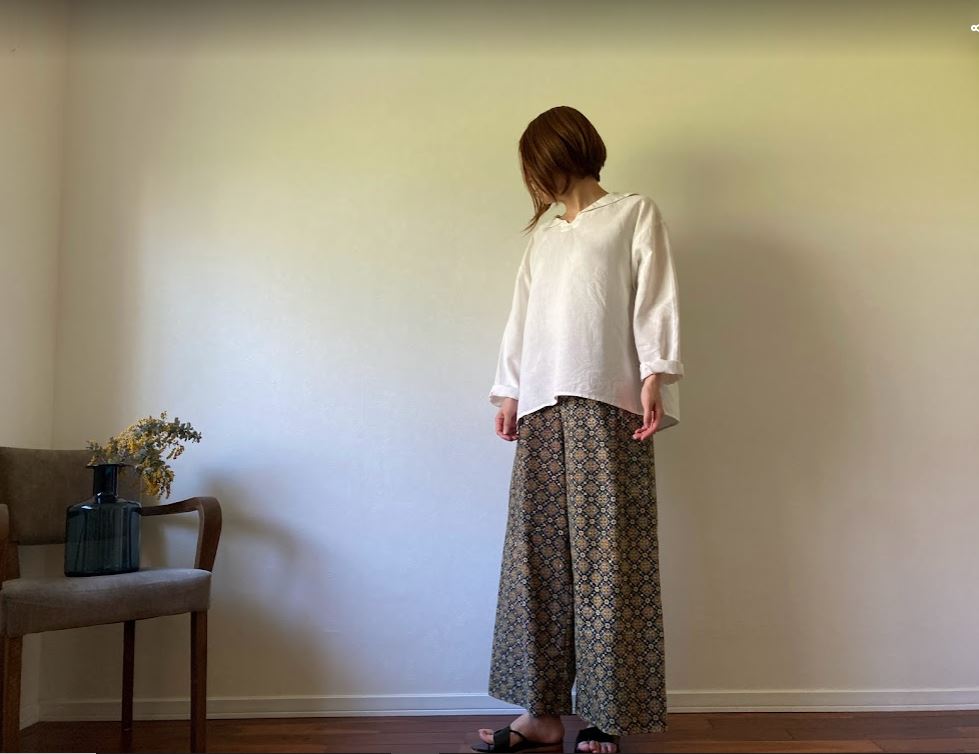 「ボトムスをジャワ更紗にする場合、無地のトップスを合わせるといいです。この夏でいうと、麻素材のシャツやプルオーバーを合わせると今っぽくなりますよ。あとは、トップスにTシャツ、ジャワ更紗のスカートの下にデニムパンツのレイヤードスタイルもおすすめです。ゆったりしたシルエットで体型を問わず着られますし、10年着用しても色落ちしません」(塩崎さん)