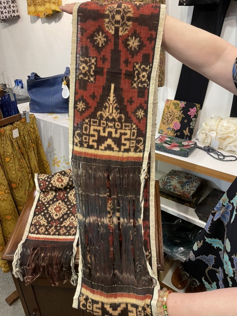 「現地の言葉で”無病息災”を意味する生地で、グリンシンというもの(布)を持っています。バリ島テンガナン村で作られているダブルイカット(縦糸も横糸も染めて織りあげたもの)で、古来の製法を守って作られています」と、ここまで聞くだけでも貴重なことが伺える。