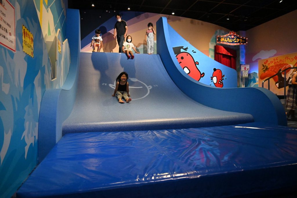 →オリジナルゲームやシアター映像で楽しく遊びながら明太子について学べるエリア。一番人気はジャンボすべり台。室内で遊べるので天候にも左右されない