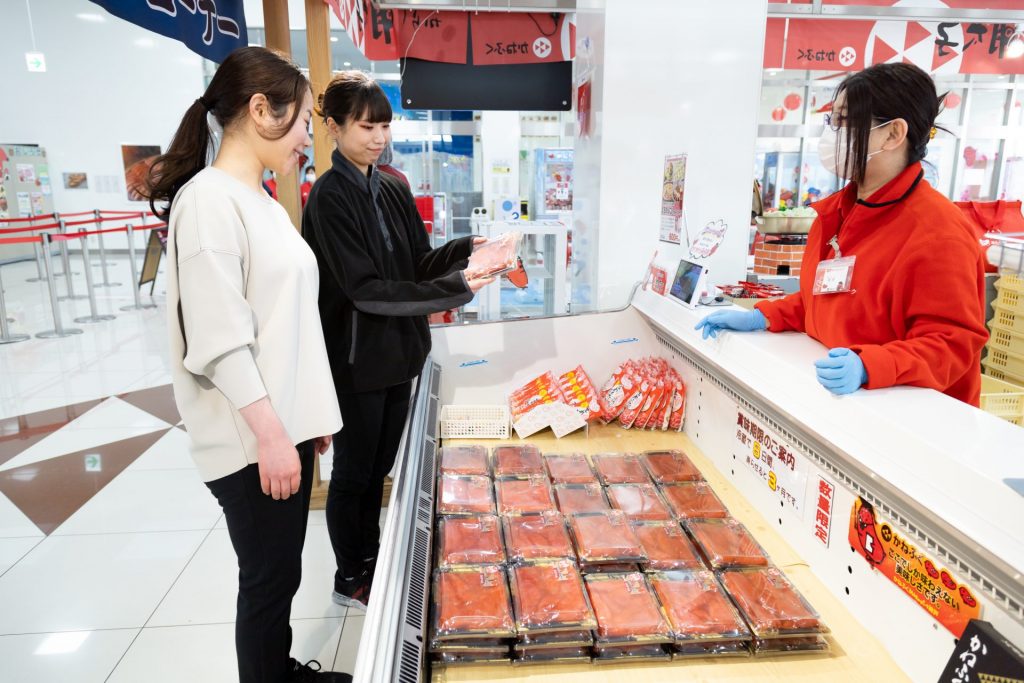 →直売店では明太子の試食を楽しめる。また、製造工場が併設されている利点をいかし、漬けあがったばかりの当地限定「できたて生明太子」を販売。その他、家庭で使いやすいお得な切れ子やボリュームたっぷりのお買い得な明太子、イカ明太、明太しゅうまい、明太子がたっぷり入った食べるラー油など、明太子の専門店ならではのオリジナル商品を多数販売