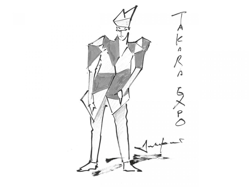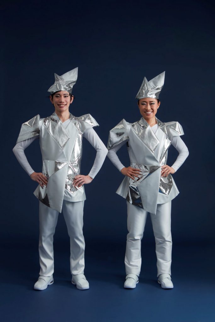 展示ブースは数多くのアクリルパネルで構成されている。これと一体感が出るように、ユニホームはホワイトとシルバーを使い、折り紙のように立体的だが、動きやすく柔らかい素材で、性別や年齢を問わず着用できる。