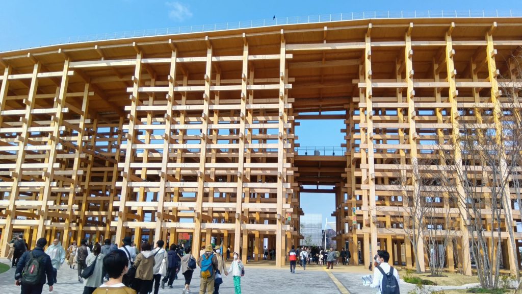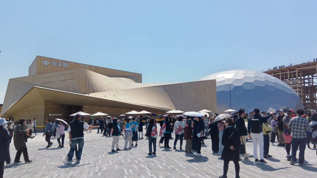 東ゲートに近い「住友館」は樹木約1000本を利用。木目調の巨大なパビリオンが目を引き、6日午前、“待ち時間・3時間”の看板を掲げた。