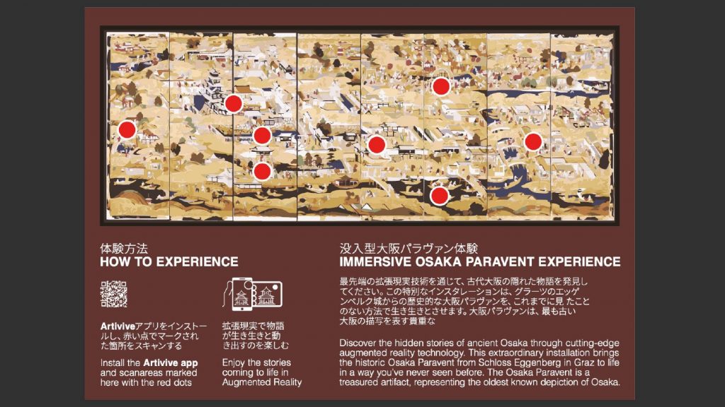 グラーツのエッゲンベルク城(世界文化遺産)に所蔵されている「豊臣期大坂図屏風」を、最先端の拡張現実(AR)技術を通じて、“動く絵巻物”として生き生きとした形で見ることができる。