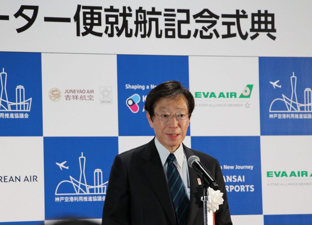 第1便着に先駆け、就航記念の式典が開催された。久元喜造・神戸市長は「神戸市は、神戸空港の国際化により新たな国際都市としての可能性を手にすることができた。この可能性を大いに開花させ、神戸が関西全体の発展に貢献することができるよう、全力で取り組みたい」と述べた。テープカットに続き、就航エアライン4社の代表者あいさつ、くす玉を割るセレモニーも行われた。