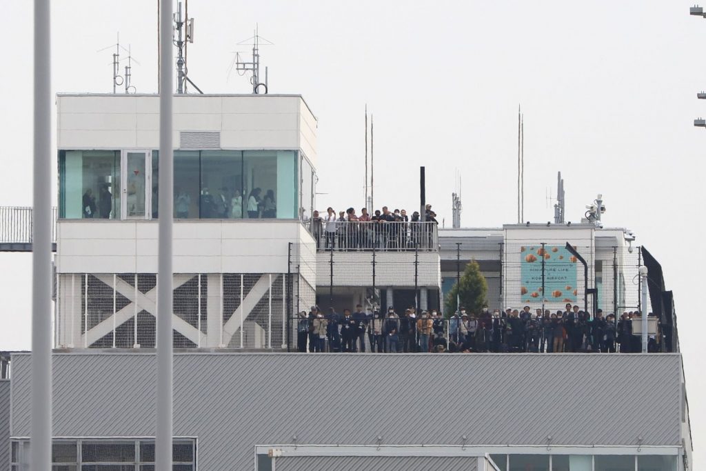第1ターミナル展望デッキには航空機を眺める大勢の人が(2025年4月18日、神戸空港)