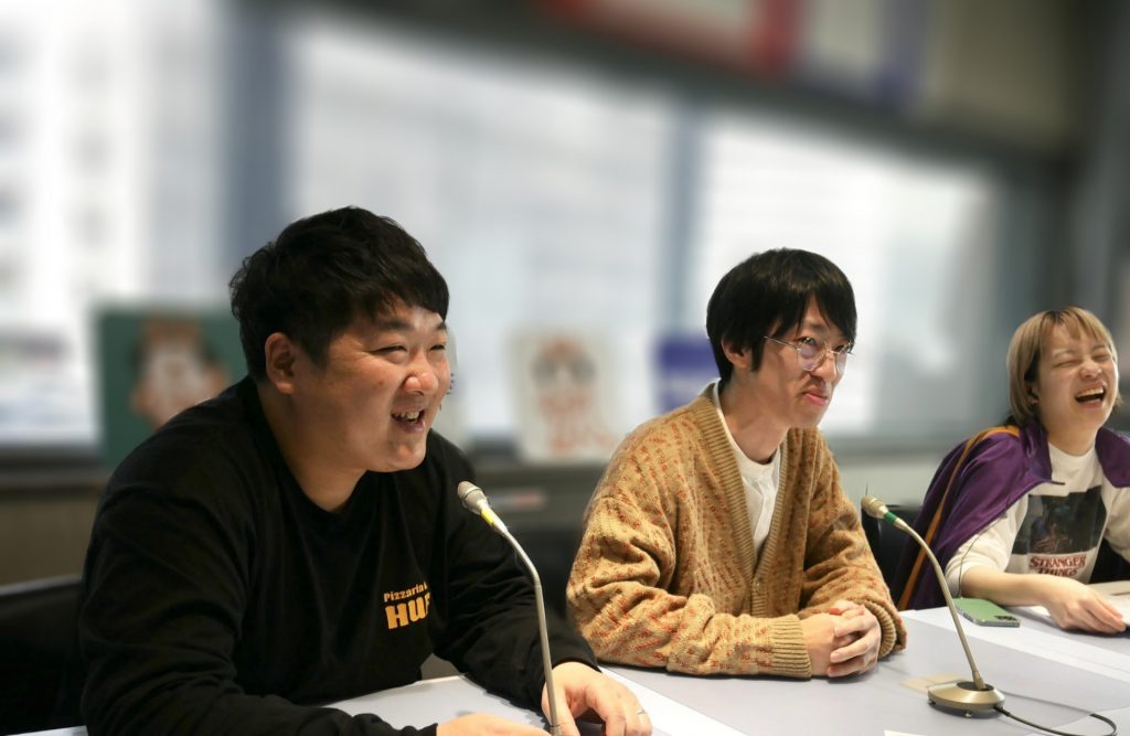 スナフキンズの松永ボディさん(左)、朝地亮介さん(中央)、はるかぜに告ぐのとんず(右)