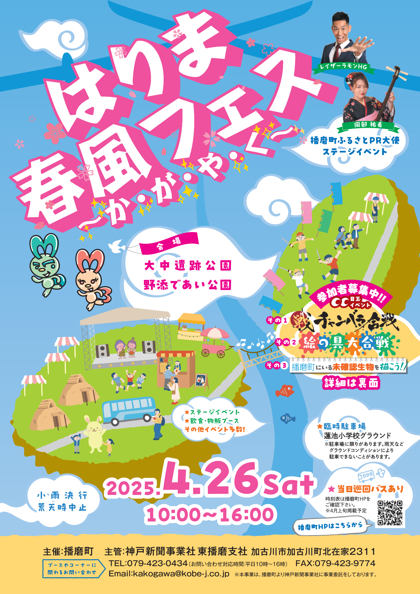 兵庫県の播磨町で、春の恒例イベント「はりま春風フェス」が、4月26日(土)に、町内の大中遺跡公園と野添であい公園で行われます。