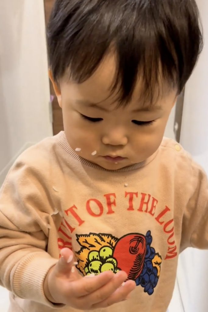 「炊飯器のご飯、食い散らかしてた(笑)」顔や服にご飯粒がたくさんついている1歳のりつくん。ママが家事をしている隙に、炊飯器にあった残りご飯を全部食べてしまったそう。「お米食べたでしょ?」と尋ねるママに、りつくんの反応は…!?