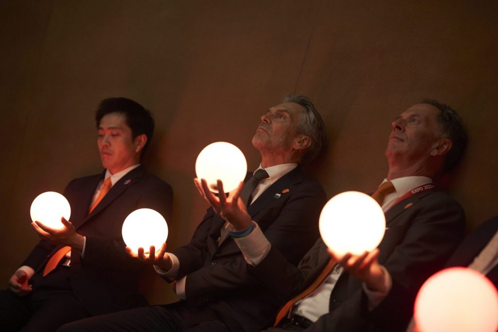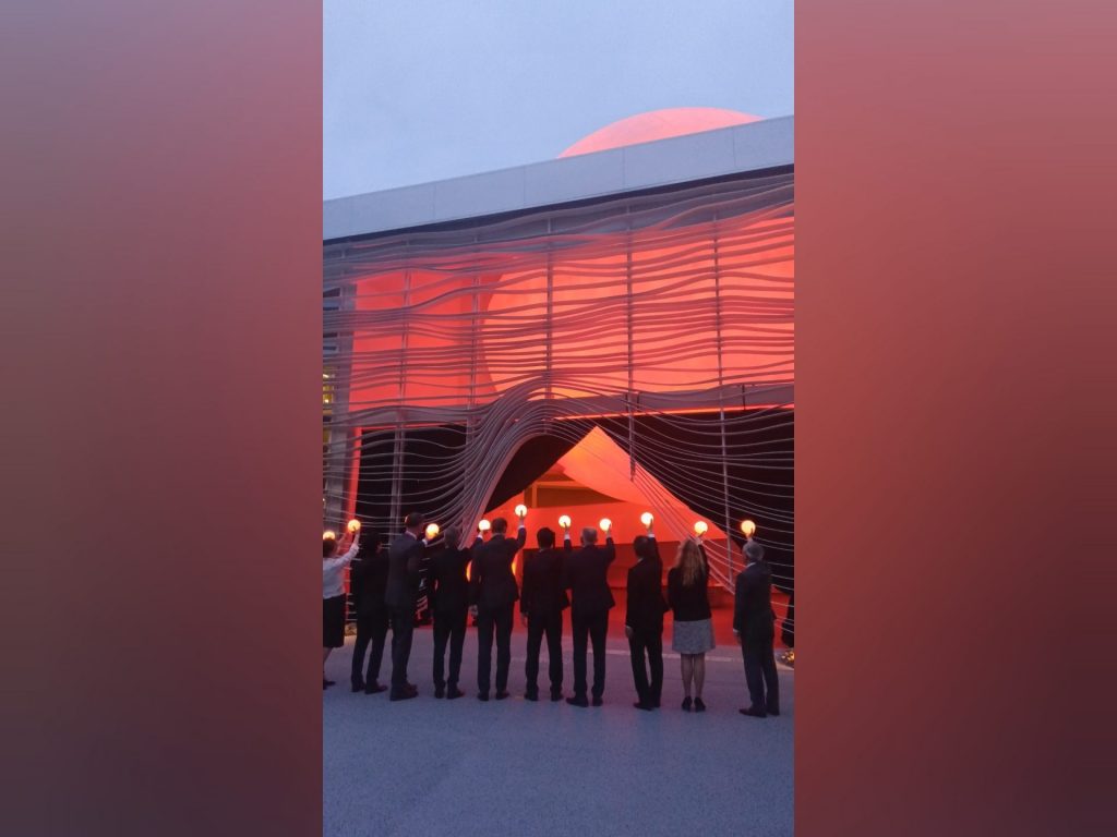 除幕式では、スホーフ首相をはじめ政府要人が「オランダパビリオン、来てや〜」と関西弁で呼びかけると、太陽をモチーフにしたパビリオンの球体が、国のシンボルカラー・オレンジ色に点灯した。