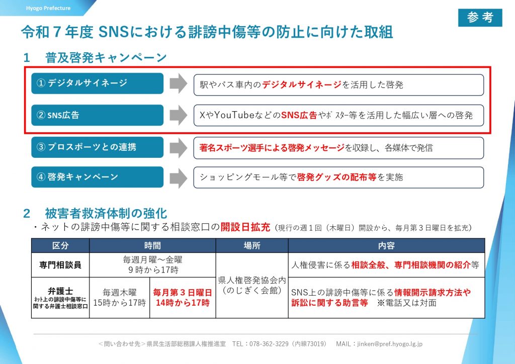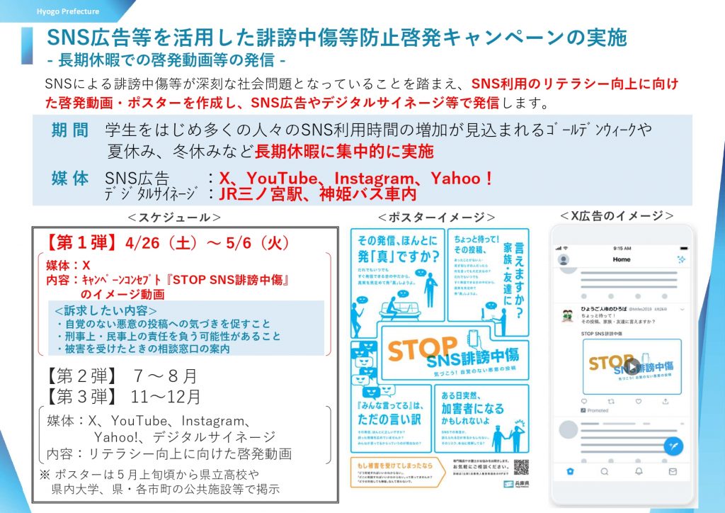 兵庫県は4月26日から、SNSでの誹謗中傷を防止するために、キャンペーン動画やポスターを作成し、Xやユーチューブ、デジタルサイネージなどで発信する。