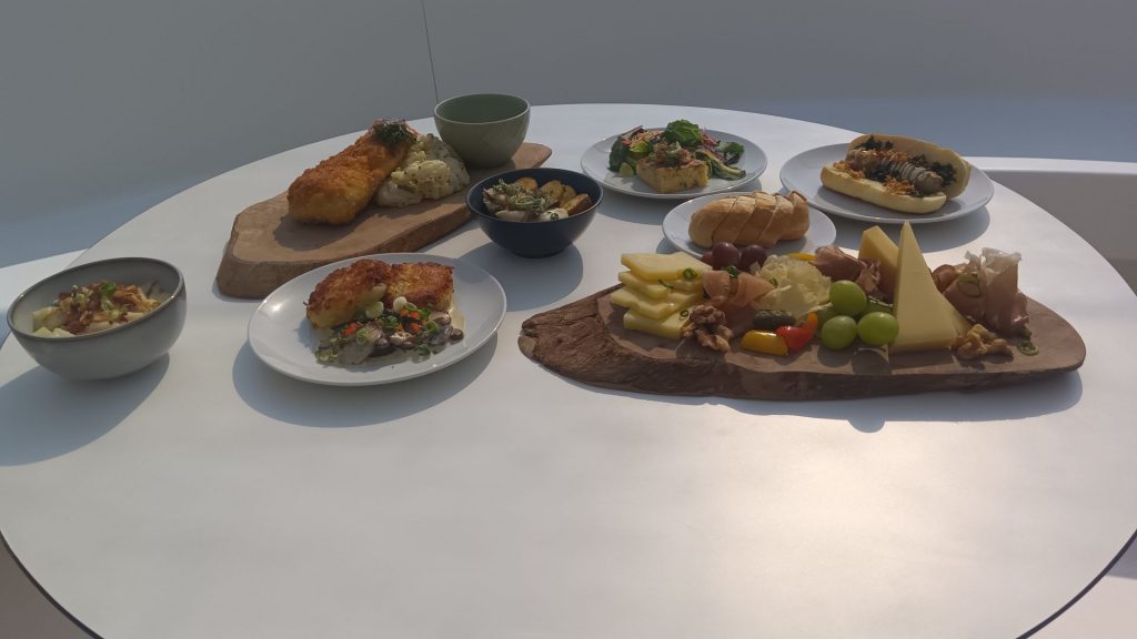 スイスパビリオンの屋上レストラン“ハイジカフェ”では、「コルドンブルー(チーズ入りカツレツ)」「ラクレットチーズ(チーズの断面を溶かしてベビーポテトにかける」「チーズフォンデュ」などの郷土料理が楽しめる。