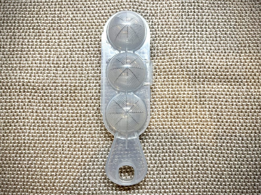 袋から取り出した容器には、3つの丸が並んでいます。ケースを開くと6つの凹みがあるので、フチがあるほうに温かいご飯を入れます。フチのぎりぎりまで入れたら、しゃもじなどでしっかりと押さえます。