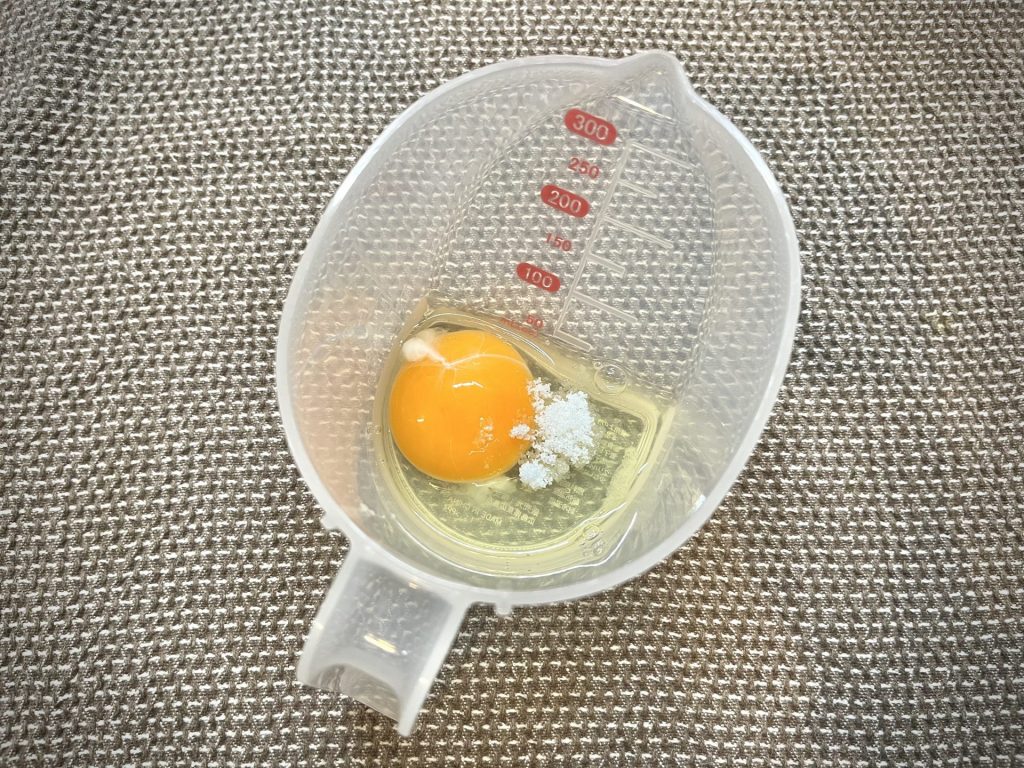 まずは、卵1個に砂糖や塩などのお好みの調味料を加え、かき混ぜます。このとき、小さな泡だて器などを使ってかき混ぜると、白身と黄身がよく混ざってきれいに仕上がります。
