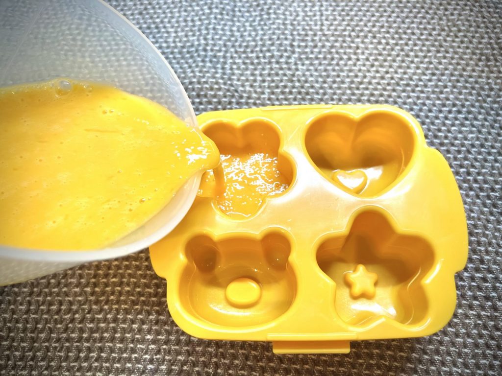 よくかき混ぜたら、容器の内側の線まで卵を流し込みます。