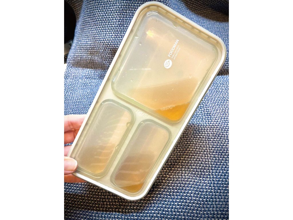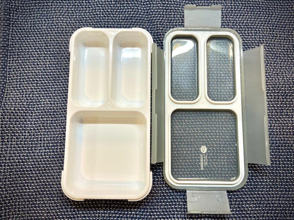 ふたを開けると3つの仕切りがあり、おかずが詰めやすい仕様になっています。試しに液体を入れて傾けてみましたが、まったく液漏れしません。