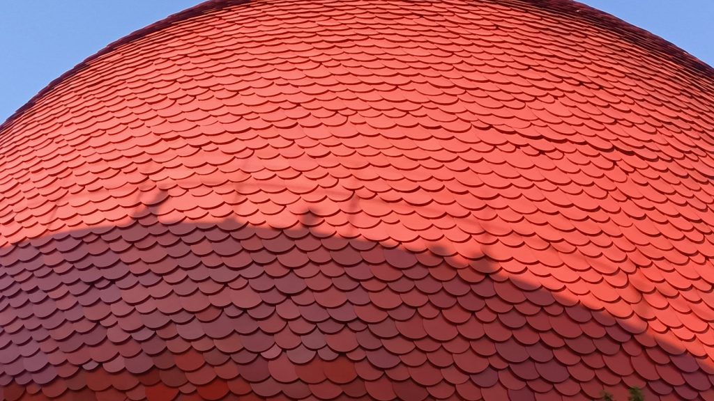 球体部分には、リサイクルされたアルミニウムの素材を2万枚以上使用する。直径18.6メートル、高さ17メートルの赤い巨大な球体。外観は「青海波(せいがいは)」と呼ばれる同心円の一部が扇状に重なり合う、鱗(うろこ)模様を描いている。