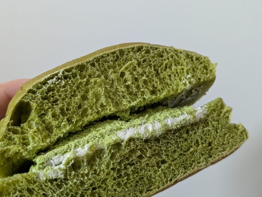 パッケージを開けた瞬間、心落ち着く抹茶の香りがふわりと広がります。ブリオッシュ生地には抹茶がたっぷり練りこまれており、食感はふかふか、むっちり。生地だけでもおいしいパンに仕上がっています。