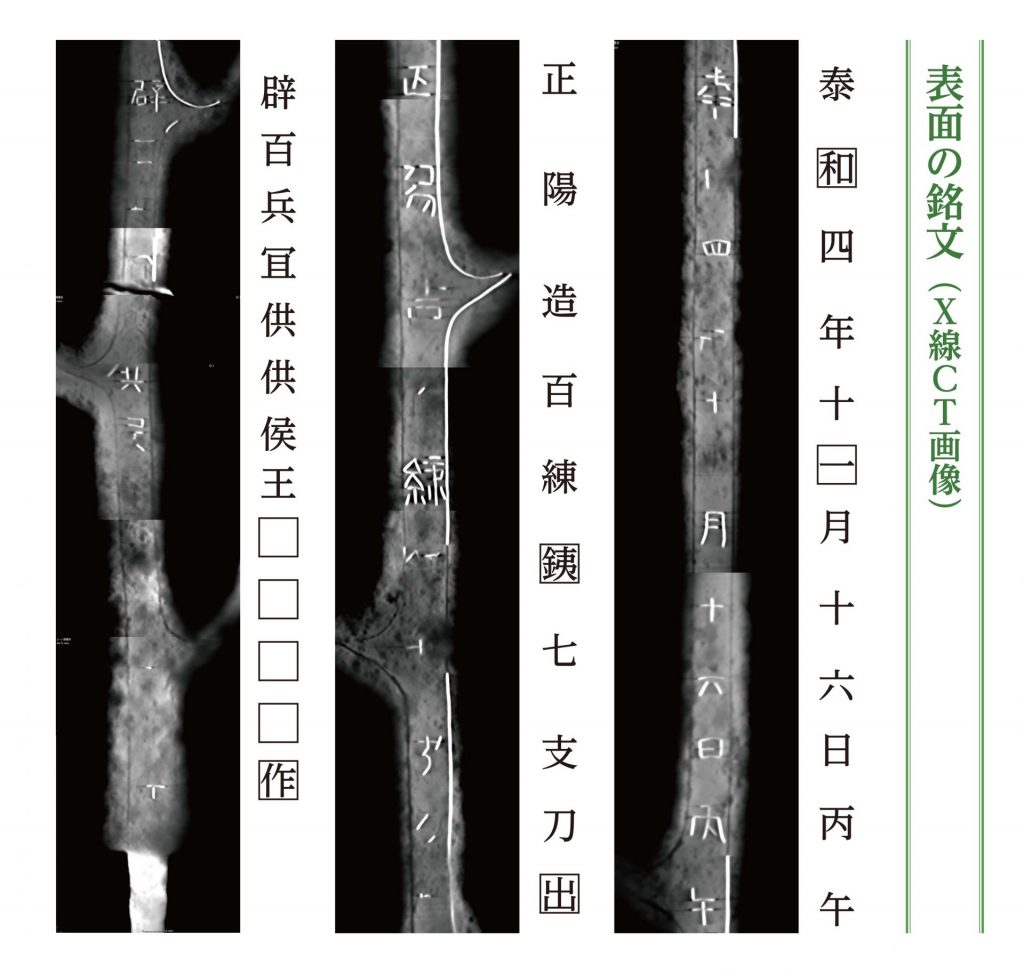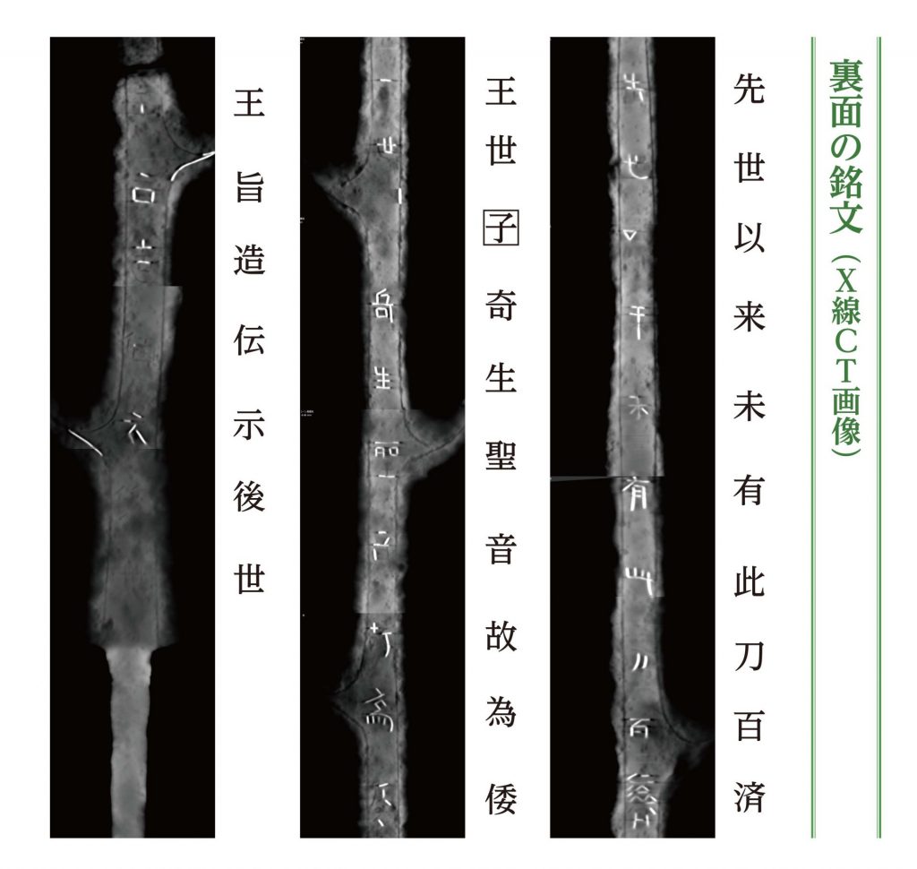 一方、同館は展覧会の目玉の1つである七支刀をこのほど初めてX線CT(コンピューター断層撮影)装置で調査した。七支刀は左右に枝刃を突出させた異形の剣。両面に計62文字の漢字が金で象嵌され、朝鮮・百済の王族が倭(日本)の王のためにつくらせたものである旨が記されている。当時の日韓交流の実態を伝える奇跡の伝世品だ。
