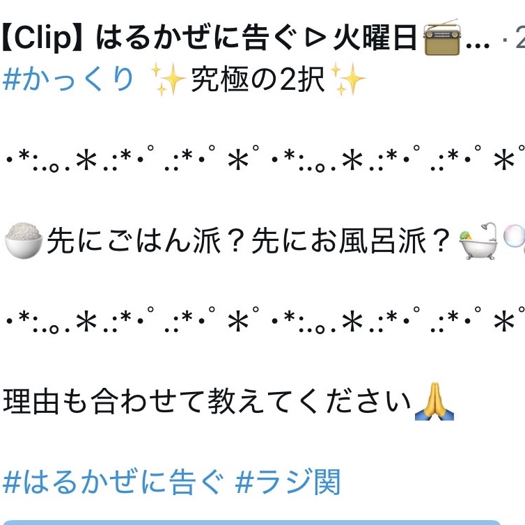 帰宅したらまず…『ごはん』or『お風呂』どっちが先? 「空腹のままお風呂に入れない」人が多数 2025/05/29 (写真2枚) お笑い芸人・はるかぜに告ぐ(一色といろ・とんず)が、パーソナリティーをつとめるラジオ番組のオンエア中にアンケートを実施。X(旧:Twitter)のアンケート機能で、帰宅後は「ごはん」と「お風呂」のどちらを先に済ませるかを調査した。 記事全文を読む 関連記事 『美容院』しゃべらないと気まずい? はるかぜに告ぐ・とんずは「しゃべらないほうが違和感」 2025/05/28 昔の写真や手紙、残すor捨てる? はるかぜに告ぐ・といろ「携帯の写真は自然となくなっていく」 2025/05/06 かばんの中身←『多い』or『少ない』? はるかぜに告ぐの2人は「ハンカチは持ち歩かない」と告白 2025/04/24 寝るときの姿勢…『上向き』or『横向き』? 若手芸人は「バンザイ寝派」独特の寝姿を披露 2025/03/27 見事に二分!? 『借りパク』経験の有無聞いてみた 若手芸人・はるかぜに告ぐのとんずはラジオ局で… 2025/03/24