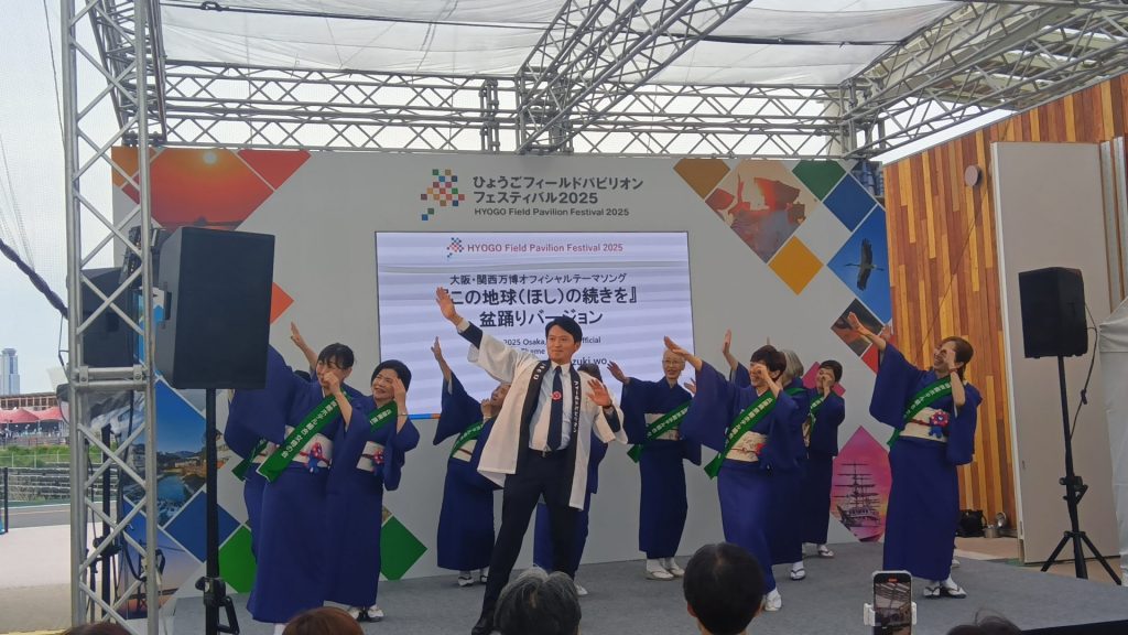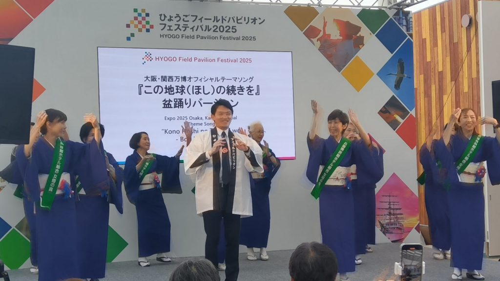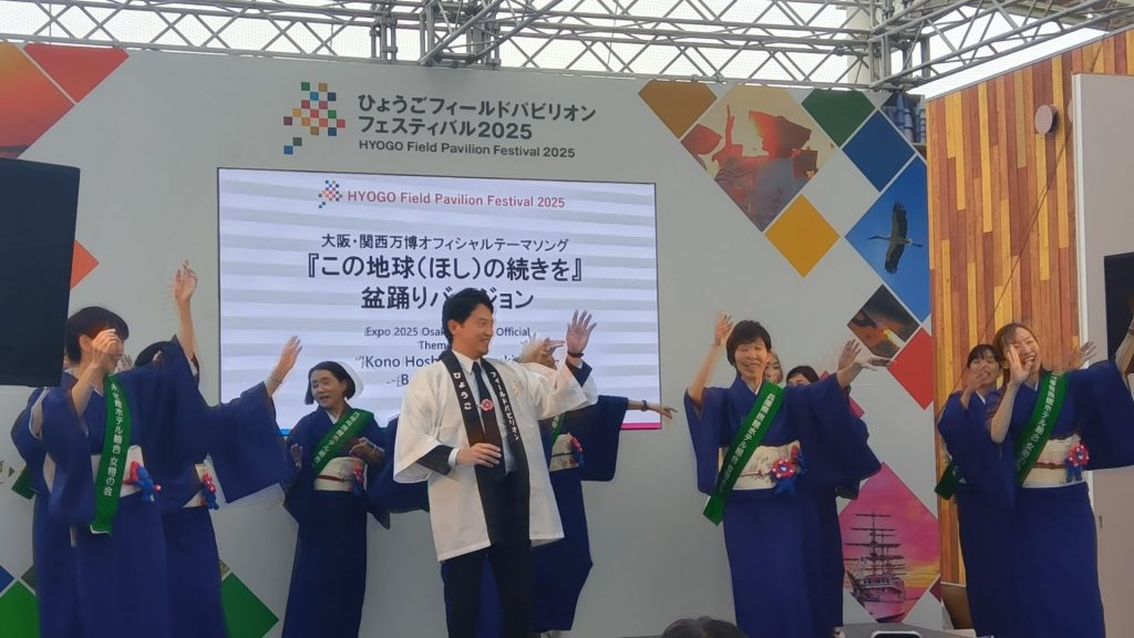 斎藤知事はステージで、兵庫県旅館ホテル生活衛生同業組合”女将の会”とともに、大阪出身の男性デュオ・コブクロが歌う大阪・関西万博のテーマソング「この地球(ほし)の続きを」に合わせ、盆踊り風の振り付けで踊った。