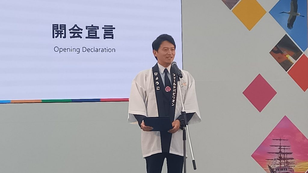 「ひょうごフィールドパビリオンフェスティバル」で開会宣言する斎藤元彦・兵庫県知事〈2025年5月26日午後 大阪市此花区・夢洲〉