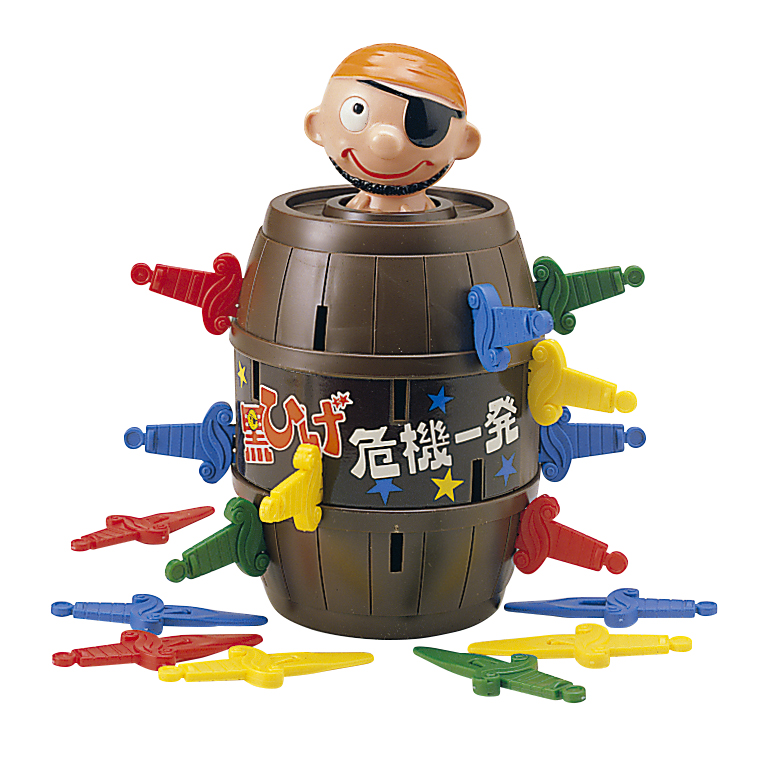 穴のあいた樽にナイフを順番に刺していき、首だけ出した黒ひげが「飛び出したら“アウト”」という単純明快かつスリリングなゲーム性がテンションを大いに盛り上げてくれます。