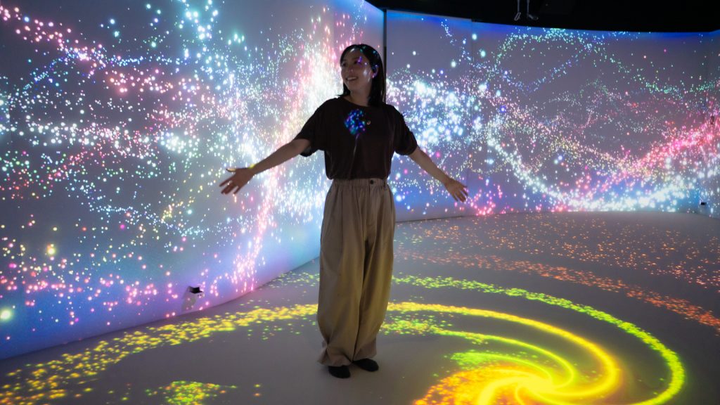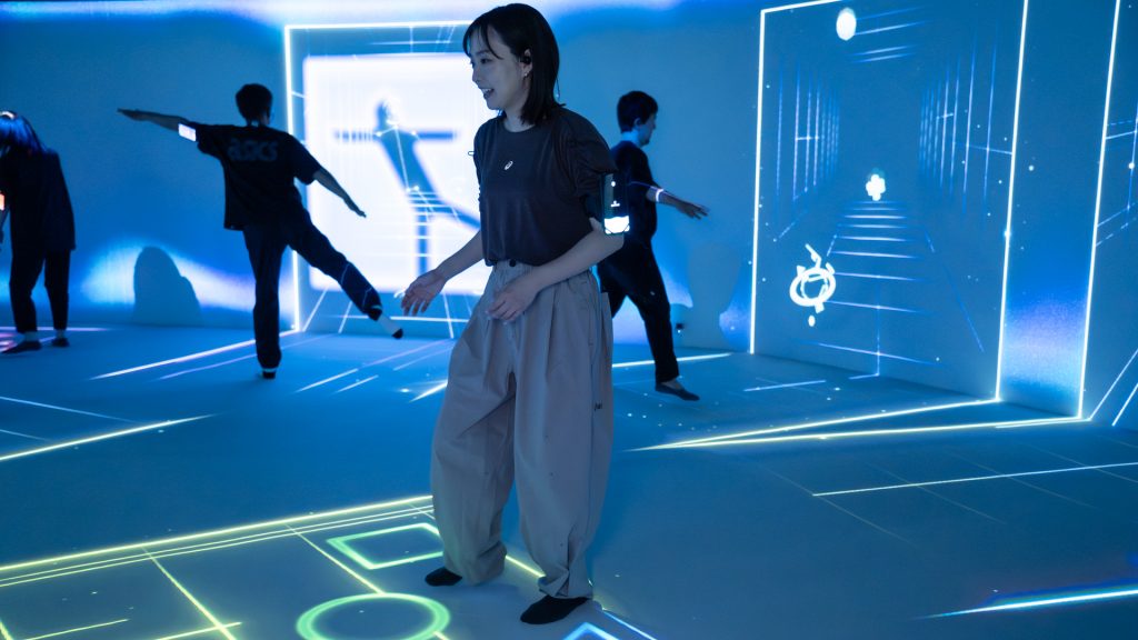 その魅力を一足先に体験した石川さんは、「すっごい楽しかったです! テーマパークみたいな感じでいろんなゲームがあって、細かく上から出てくる棒をよけたり、落ちているマークをあわせたり、ジャンプ、スキップしてみたり……あっという間に終わる、すごく楽しい15分でした」と、感想をコメント。アシックスの研究により、心身にポジティブな影響を与えるという「15分9秒」の時間で構成された、光と音で演出された没入型空間を満喫したそう。