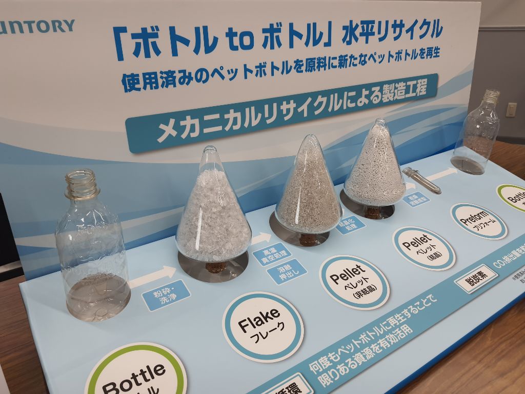 「市がペットボトルを回収・選別後、ひとまとめに圧縮します。それを大栄環境がリサイクラーの役割を担う豊田通商に配送します。粉砕・洗浄・除染の工程を経て、ペットボトルの原料である“ペレット”を生成。これをサントリーがペットボトルにして飲料詰め、販売するという流れです」(中山さん)