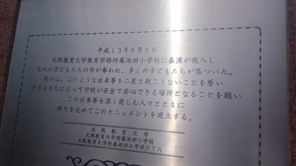 2001年6月8日午前10時12分ごろ、包丁2本を隠し持った宅間守・元死刑囚が、学校東側の門から校内に侵入。校舎1階の教室や廊下で児童らを次々に襲い、2年の女子児童7人と1年の男子児童1人が死亡、児童13人と教諭2人が重軽傷を負った。元死刑囚は現行犯逮捕された。一審・大阪地裁で2003年、死刑判決が言い渡され、控訴を取り下げ刑が確定した(2004年9月死刑執行時・40歳)。