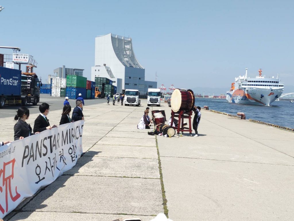 韓国・釜山港から約17時間の航海を経て、大阪港国際フェリーターミナルへ初入港した4月14日朝には、和太鼓の演奏と横断幕を掲げた関係者による歓迎セレモニーが盛大に執り行われ、韓国からの乗客が次々と笑顔で下船した。