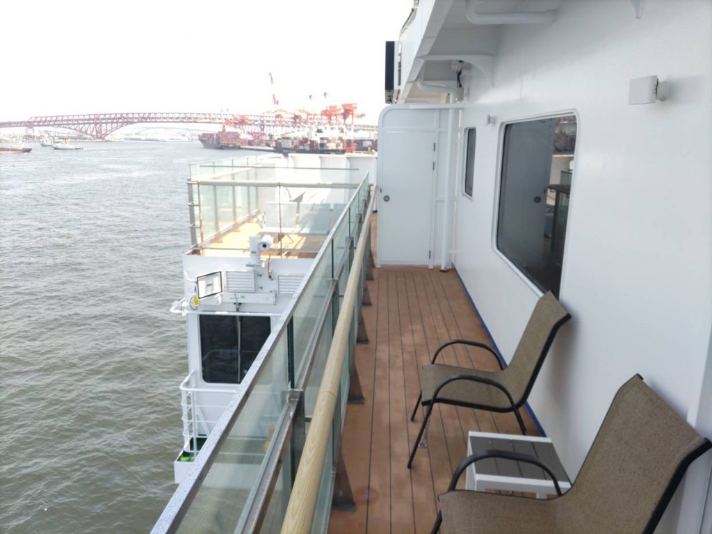 「パンスターミラクル」号は、総トン数2万2000トン、全長171メートル、全幅25.4メートル 。客室は5タイプ102室を備え、乗客定員は355名。25.2ノットの航海速力を誇り、8層のデッキには客室スペース3層のほか、貨物積載能力も有する。2024年10月に韓国の造船所で進水したばかりの最新鋭船で、白を基調とした船体にオレンジと紺色の装飾が特徴的だ。