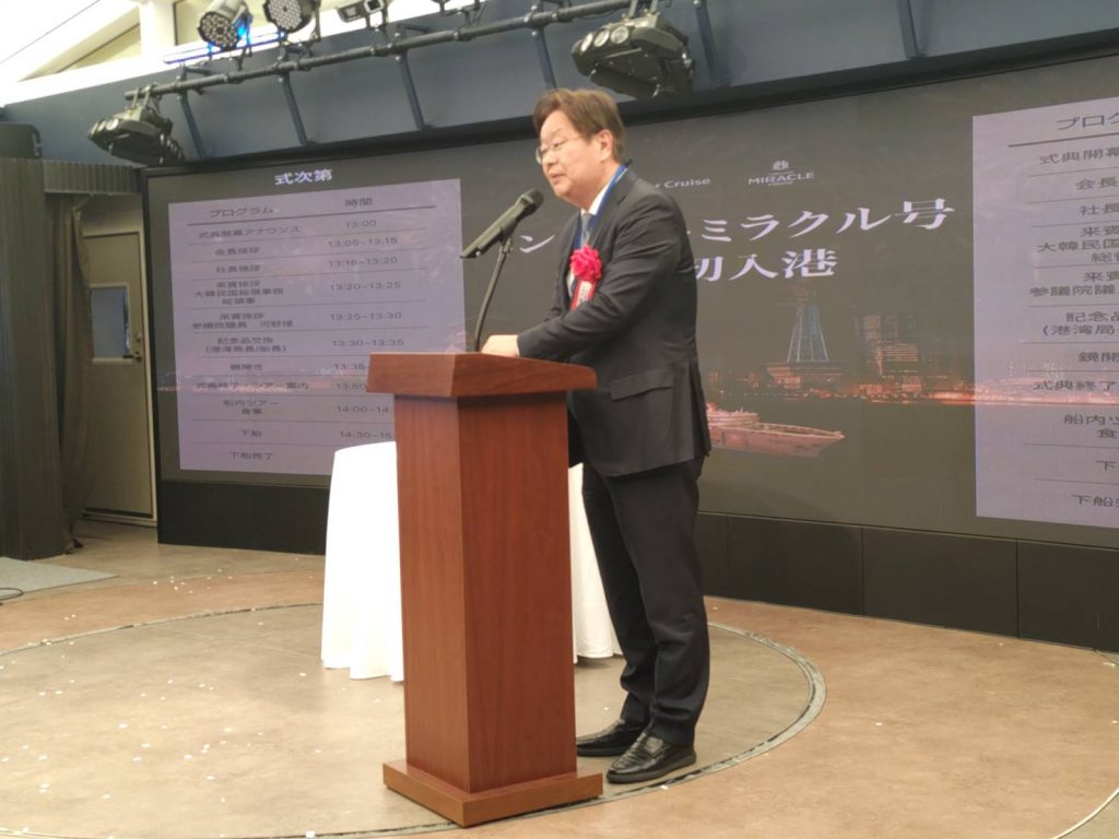 同日船内で行われた就航記念式典では、パンスターグループ代表取締役会長の金泫謙(キム・ヒョンギョム)氏、株式会社サンスターライン代表取締役社長の舎野祝光(しゃの・のりみつ)氏らが登壇。航路の歴史や新造船の魅力を紹介し、今後の展望を語った。式典には、駐大阪韓国総領事や港湾関係者も来賓として出席し、祝辞を述べた。